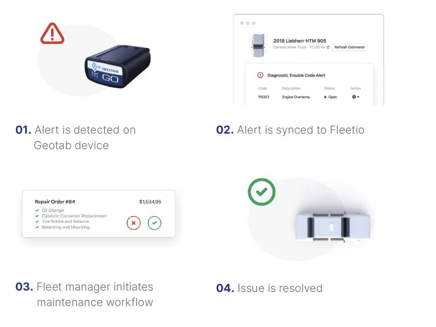 Geotab advantage: live odometer/engine hours, fault codes, and DVIR flow from Geotab to Fleetio to auto-trigger PMs, open work orders, and prioritize critical issues—configured and monitored by Advantage One.